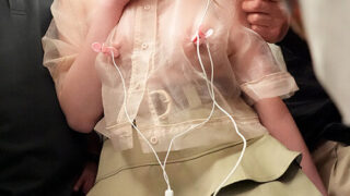 電車の中でインナーを抜き取られ透け巨乳を見られる羞恥で抵抗できないシアーシャツ女子